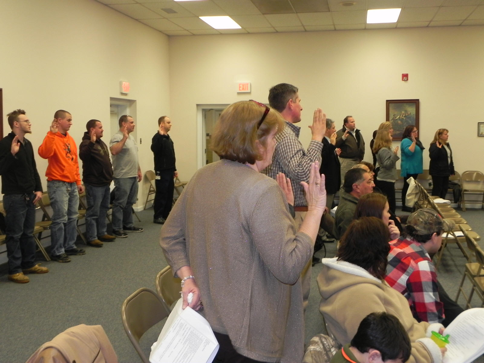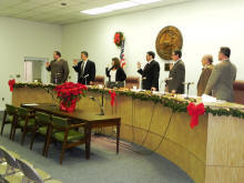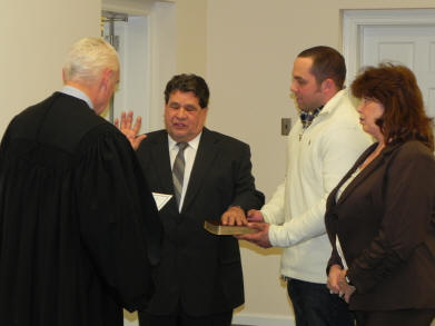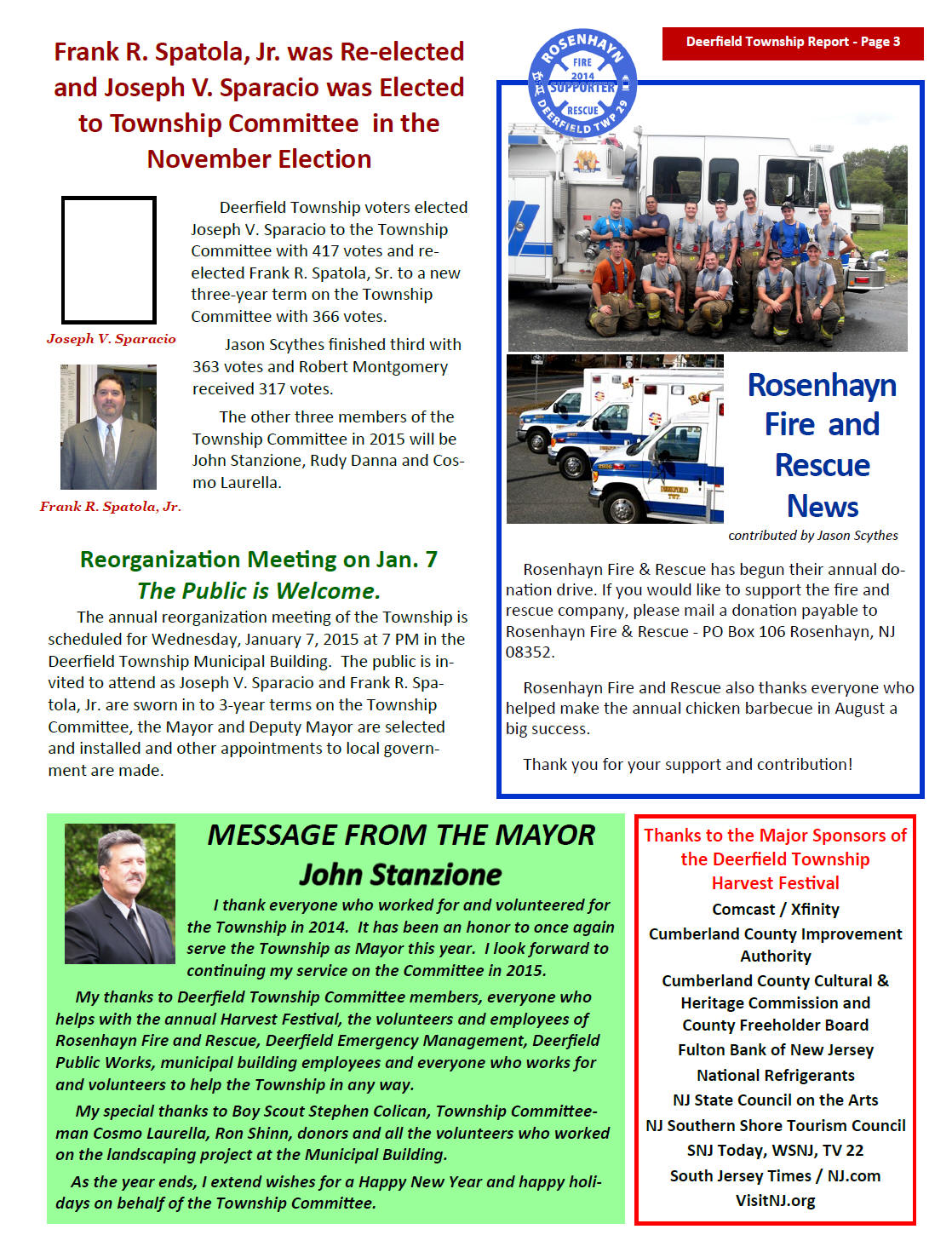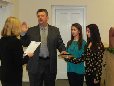 in by Township Solicitor Michael Testa. John Stanzione, who served as Mayor in 2014 was elected to serve as Deputy Mayor. Committeeman Frank Spatola was sworn in to a new three-year term on the Township Committee. Stanzione was sworn in in by County Clerk Celeste Riley and Spatola was sworn in by Solicitor Mike Testa. "I congratulate Frank Spatola for his re-lection, John Stanzione for selection as Deputy Mayor and look forward to welcoming newly elected Committeeman Joseph V. Sparacio to the Committee when he returns from his Air National Guard deployment in Kuwait, said Mayor Laurella. He also thanked the Committee for putting their trust in him by selecting him as Mayor. Mayor Laurella noted projects accomplished in 2014 including new landscaping at the municipal hall thanks to Boy Scouts and other volunteers, improved security in the municipal building with cameras added and repaving of Cedar Street. He thanked public works employees and office staff and other employees and volunteers for their good work for the Township. He said in 2015 the Township will purchase a new rescue truck for Rosenhayn Fire and Rescue to replace one 15 years old, will sell the former Carmel Fire Hall and do all they can to keep local purpose taxes low. He ended by thanking his wife Doris for all of her support as he has served on the Township Committee for 26 years. |