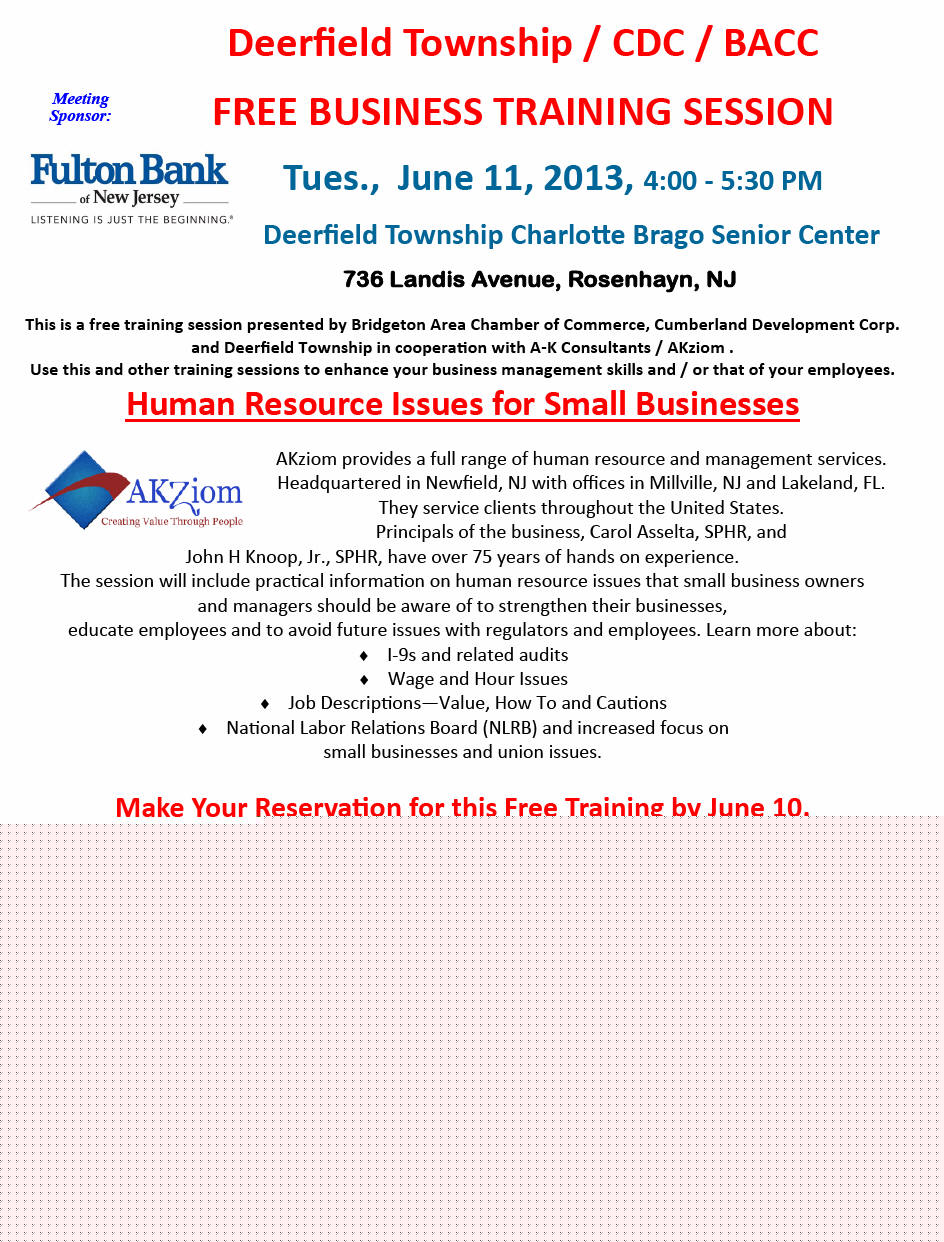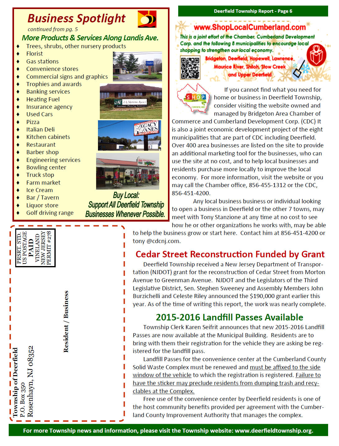 ![]() The Cumberland Development Corporation (CDC) and Bridgeton Area Chamber of Commerce (BACC) partnered with Deerfield Township Committee to presented one of its series of free business training and information meetings in Deerfield Township on June 11. Business owners, employees, public officials and representatives of CDC and BACC attended the business information meeting. The Deerfield Township meeting was sponsored by Fulton Bank of New Jersey. In Deerfield Township, the business meeting was opened by Mayor Frank R. Spatola, Jr. and Chamber Chairman Frank T. Harris, Sr. Deerfield’s Deputy Mayor Rob Montgomery introduced the two local businesses that were spotlighted at the meeting. Russell Automotive was represented by Alvin Russell, owner, and BRECO, Inc. also known as Bridgeton Restaurant Equipment Co. was represented by Ernie Hutchinson, owner. Russell highlighted his expansion and the need for businesses to stay up to date on changes in their industries and to encourage employees to grow in knowledge of and satisfaction with their jobs. Hutchinson commented on his company’s growth and expansion related to the growth of WaWa stores here and in other states. Innovation and excellent service were sighted by him as keys to business success. Jody Hirata of The BACC Board and Century Savings Bank talked about these items especially the partnership with Cooperative Business Assistance Corp. for alternative loans. Howard Henderson, NJ Director of U.S.D.A. Rural Development explained his agency and its role in community and economic development in the rural areas of New Jersey. Christie DiLeonardo of Cumberland County One-Stop Center and the Cumberland / Salem County Workforce Investment Board told the participants about the services available to employees and employers through their offices and through services provided by partners like Cumberland County College, Cumberland County Technical Education Center and Cumberland Salem Workforce Education Alliance. Information about the Direct Install Program called South Jersey Energy Service Plus was presented by Robert Senski. This includes energy efficiency audits for businesses and municipalities and up to 70% grant funding for the purchase and installation energy efficient lighting and other equipment. Click here for a PDF version of this Deerfield Township Business meeting notice.
